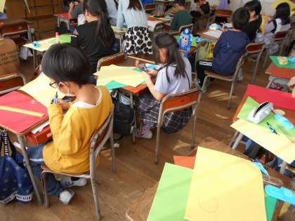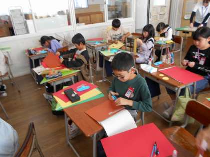 葉っぱに見立てた色画用紙を使い、切ったり貼ったりしました。