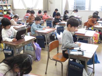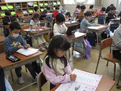 1組では、プリント学習が終わった子供から、パソコンのドリル学習に取り組みました。自分の進度に合わせて、算数や国語の問題を行っています。