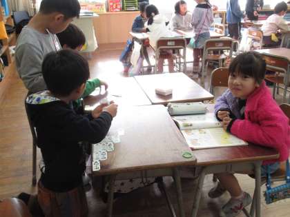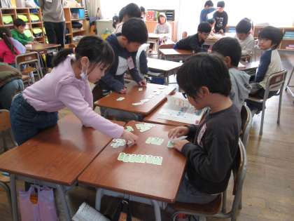 2組では、「たしざん」でカードを使って学習を行いました。計算カードを順序よく並べたり、友達とカードを使って問題を出し合ったりしました。計算がはやくなりました。
