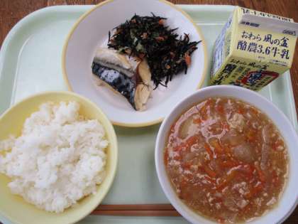 11月17日今日の献立は、ごはん、牛乳、さばの塩焼き、ひじきのごま和え、じゃがいものそぼろ煮です。
