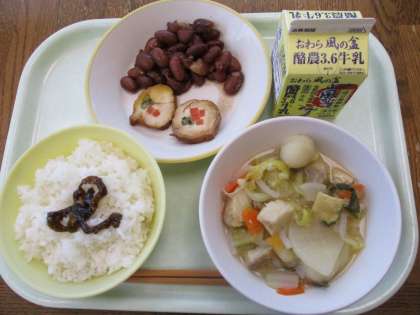 11月22日今日の献立は、ごはん、牛乳、野菜の肉巻き、煮豆、大漁鍋、のり佃煮(写真ではごはんの上)です。