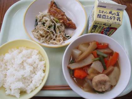 今日は、「関東だき」が出ています。おでんのことを関西では関東だきと呼ぶようです。味付けや具材も多少違っているようです。給食の関東だきは、薄口醤油で味付けてあり、汁もあり、ごはんと相性ぴったりです。