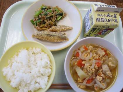 12月6日今日の献立は、ごはん、牛乳、きびなごの唐揚げ、納豆和え、親子煮です。