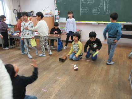 「みんなであそぼう あきのおもちゃランド」を1年3組で開きました。1年1組と2組の子どもたちがお客さんとしてきてくれました。