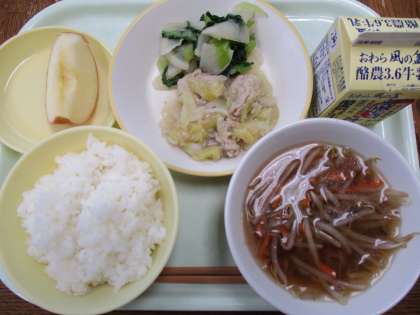 1月10日今日の献立は、ごはん、牛乳、豚肉の塩こうじ炒め、かぶの色どり、ワンタンスープ、りんごです。