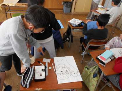 カーボン紙を使って板に写しました。ずれないように確認をしながら丁寧に描きました。