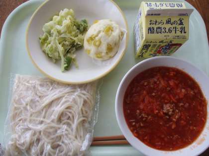 1月16日今日の献立は、ソフト麺のミートソースかけ、牛乳、蒸しパン、グリーンサラダです。