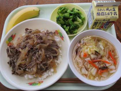 1月23日今日の献立は、パワーぎゅうぎゅう丼(麦ごはん)、牛乳、ゆでブロッコリー、具だくさん汁、バナナです。