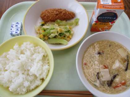 1月25日今日の献立は、ごはん、超回復オレンジジュース、ささみフライ、コーン和え、かきたま汁、ポケットチーズです。