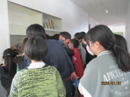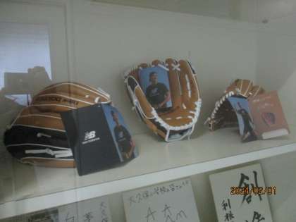 メジャーリーガーの大谷翔平選手から贈られた野球グローブ3つが大久保小学校に届きました。グローブに添えられていた大谷選手からのメッセージを校内放送で紹介し、グローブは図工室前に展示しました。休み時間には、たくさんの子供たちが本物のグローブを見ようと集まってきていました。