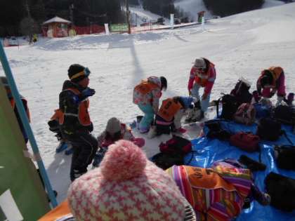 はじめてスキー靴を履く子も多く、インストラクターの先生に手伝っていただきながら準備をしました。