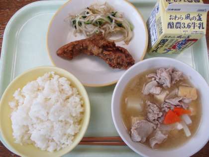 2月8日今日の献立は、ごはん、牛乳、魚の利休揚げ、もやしのおひたし、豚汁です。