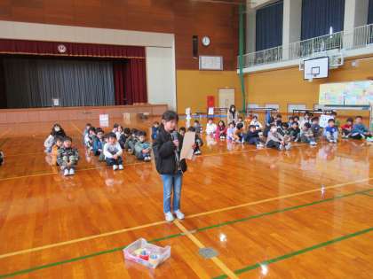 「年長さんとなかよしいっぱい集会」に向けて、体育館で集会のリハーサルを行いました。ど場所場所でお店を開くのか、どんな動きをするのか、台詞などを確認しました。子供たちは、張り切って取り組みました。
