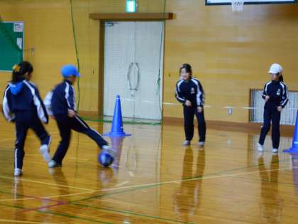 サッカーの学習が始まっています。コートを3分割して行うグリッドサッカーでは、チームで協力してパスをつながないと得点につながりません。少しずつパスがつながるようになってきました。