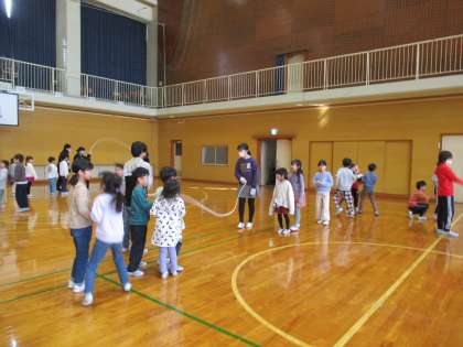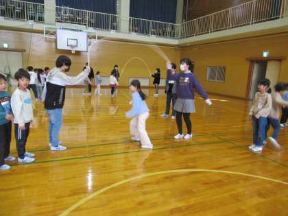 大久保タイムに、体育館で8の字跳びの練習をしました。8の字跳びのこつをつかむのに、何度も練習している今日この頃です。6年生さんが縄跳びを回してくれたり、アドバイスをしてくれたりしました。がんばっています。