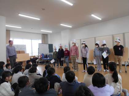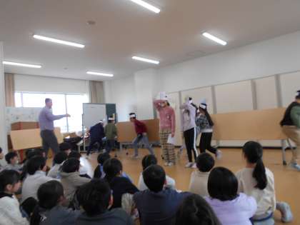 動物たちのかくれんぼの様子が伝わるように、お面をつけたり動きをつけたりしました。はじめは緊張していましたが、堂々と発表しました。