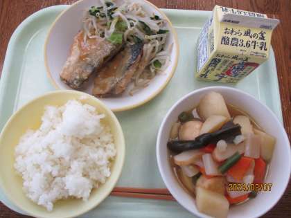 3月7日今日の献立は、ごはん、牛乳、魚の甘味噌かけ、おひたし、関東だきです。