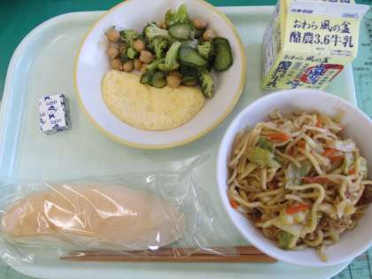 今日の給食は、減量コッペパン、牛乳、焼きそば、オムレツ、ビーンズサラダ、ポケットチーズです。