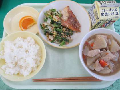 今日の給食は、ごはん、赤魚の塩焼き、炒り大豆和え、根菜のごま煮、清見オレンジ、牛乳です。