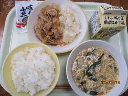 3月13日今日の献立は、ごはん、牛乳、豚肉のキムチ炒め、粉ふきいも、中華かきたま汁、味付け小魚です。