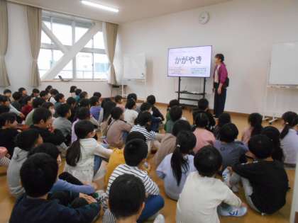2年生全員で集まり、学年目標や1年間の行事、今週の校外学習について話をしました。また、今年の学年目標「かがやき」に向けて、「みんなにやさしくしたい」「話をしっかり聞きたい」など自分たちが大切にしたいことを考えました。