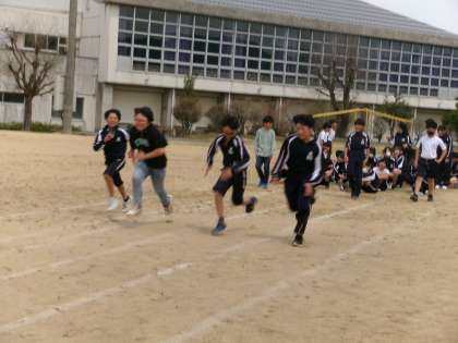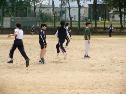 晴天のもと、グラウンドで体を動かしました。担任も混じって、おにごっこや50m走を楽しみました。