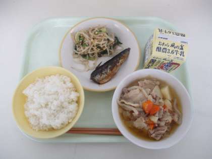 今日の献立は、ご飯  肉じゃが  鰯の梅煮  炒り大豆和え  牛乳 でした。