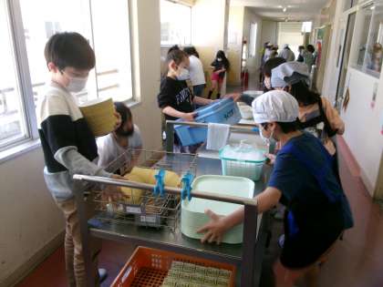 給食準備時には、当番ではない子供たちも積極的に手伝ってくれるすがたが見られます。みんなで協力して早く食べ始められるように頑張っています。