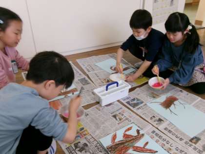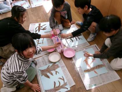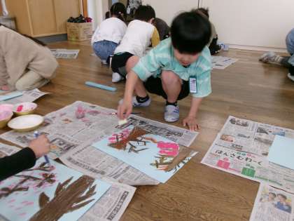 クレパスで木の幹や枝、絵の具で花びらを描きました。