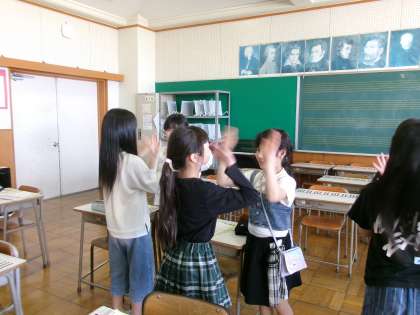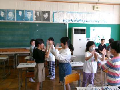 4月16日(火) 4年生 音楽 公開日 2024/04/16 更新日 2024/04/16 4年生 音楽の授業では、「小さな世界」の歌に合わせて手をたたいたり、足踏みをしたりしてリズムにのることを楽しみました。