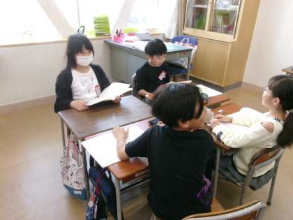 国語の授業では、「白いぼうし」を読んだ感想をグループで交流しました。不思議だと感じたところを話し合ったり、共感し合ったりしながら、みんなの思いを共有しました。
