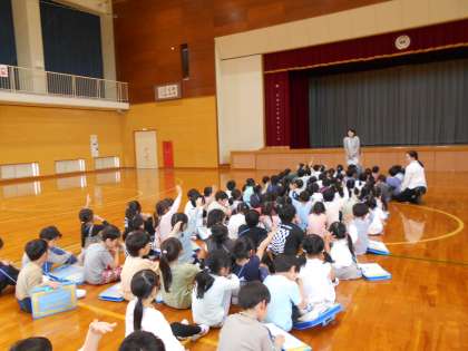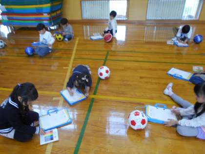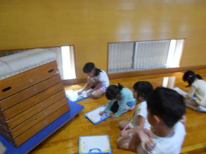 今日は2回目の学校探検で体育館に行きました。 器具庫の中を見て、たくさんの器具に驚いていました。