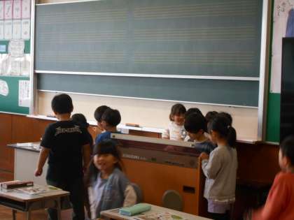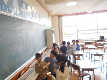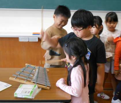 音楽室の探検をしました。色々な楽器を鳴らしてみました。