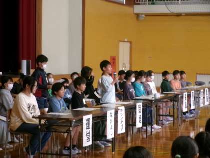 4月26日(金) 6年生 児童総会 公開日 2024/04/27 更新日 2024/04/27 6年生 全校が参加して児童総会が行われました。児童会目標の承認のあと、各委員会から活動のめあてや活動内容について発表がありました。6年生の委員長や副委員長が堂々と全校に説明を行っていました。