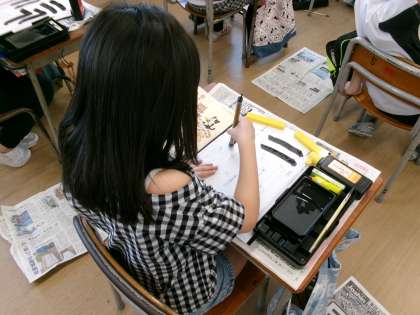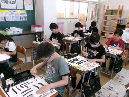 4月26日(金) 4年生 書写 公開日 2024/04/27 更新日 2024/04/27 4年生 書写の授業が始まりました。初回の今日は、正しい姿勢や筆の持ち方、習字道具の準備の仕方を確認した後、点画の種類に気を付けて書きました。みんなとても集中して、よい姿勢で頑張っている様子が見られました。