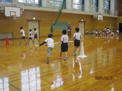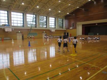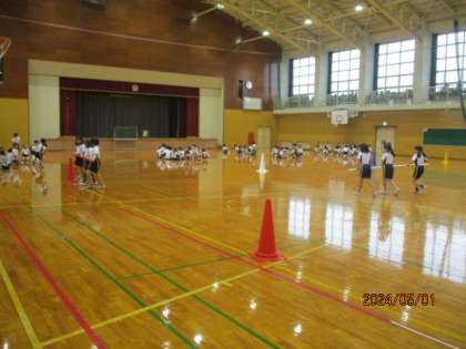 中学年で行う団体競技「台風の目」の練習を始めて行いました。まずは、歩きながらの動きの確認。練習を重ねながらチームワークを高めていきます。