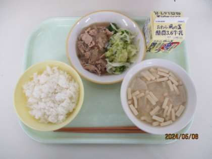 今日の献立は、ご飯 焼肉 みそ汁 添え野菜 牛乳 でした。