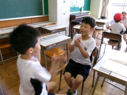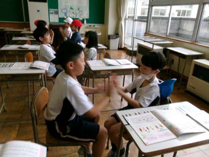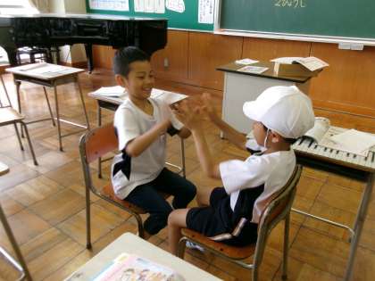 音楽の学習では、歌に合わせて手拍子をしました。2拍子を感じながら、友達と楽しくたたきました。