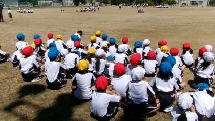 リレーの練習をする1・2・3年生を全力で応援する1年生です。