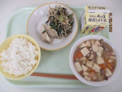 今日の献立は、 ご飯 えびと豆腐のうま煮 焼き餃子 小松菜とひじきのナムル 牛乳 です。