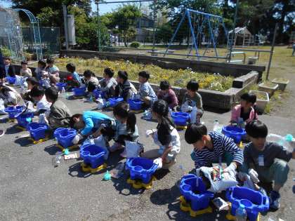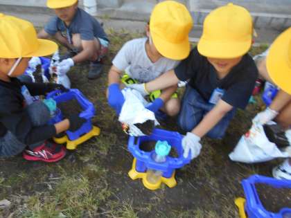 観察したあさがおのたねを植えました。 困ったところは友達と協力していました。