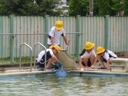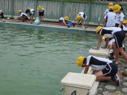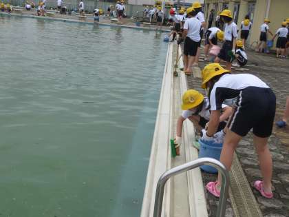 これまで、きれいにしてもらったプールで授業をしてきた子供たちでした。しかし、今年は全校のために働き、1年間の汚れを一生懸命に落とそうとしていました。