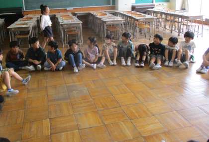 1組は、学級活動の一つとして、はんかち落としをしました。みんなではんかち落としをするのは初めてでしたが、楽しく活動しました。また、「こんなルールがあったらいいな」ということを提案する子供もいました。一度遊んでみて、みんながもっと楽しめるルールでやってみたいと考える子供もいました。みんなで話合って決め、遊び、なかよしの輪を増やしていきたいと思います。