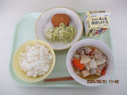 今日の献立は、ご飯 大根の味噌煮込み コロッケ ゆでキャベツ 牛乳 でした。