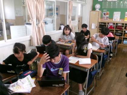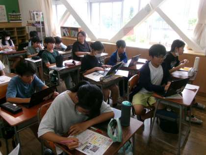 社会では、震災復興の願いを実現する政治について学習しています。災害のときの政治の働きについて、パソコンやプリントを使ってまとめました。
