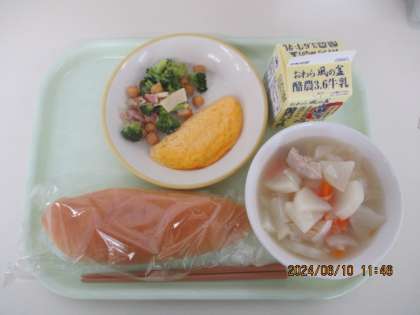 6月10日(月) 今日の給食 公開日 2024/06/10 更新日 2024/06/10 給食室から 今日の献立は、コッペパン ポトフ チーズオムレツ きのこと豆のアヒージョ 牛乳でした。 なお、ジャガイモが入荷困難なため、代わりに大根が多めのポトフとなりました。