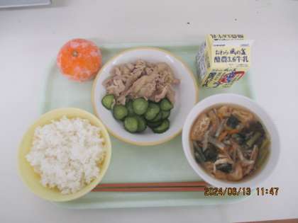 今日の献立は、ご飯  豚肉のジャンロー  沢煮椀  きゅうりもみ  冷凍みかん  牛乳  でした。