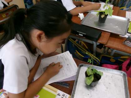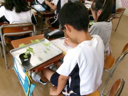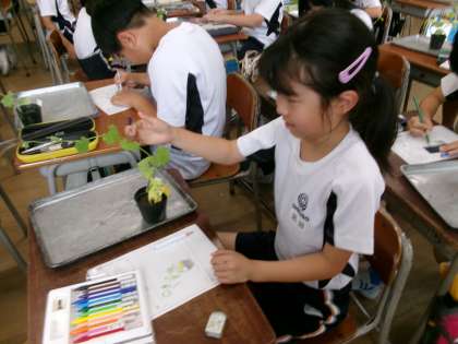 教室で育てているヘチマのつるがだいぶ伸びてきたので、明日植え替えをしようと思います。今日は植え替え前にヘチマの観察日記を書きました。色や形に注目して詳しくスケッチしました。