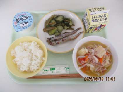 今日は3回目のかみかみ献立です。ご飯  塩肉じゃが  ししゃもの米粉揚げ  茎わかめの中華和え  ヨーグルト  牛乳  でした。