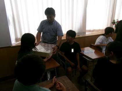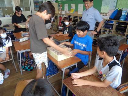 教室の中では、学校生活でかかる税金の額について知ることができました。また、子供たちは1億円の模型にふれ、その重さに驚いていました。